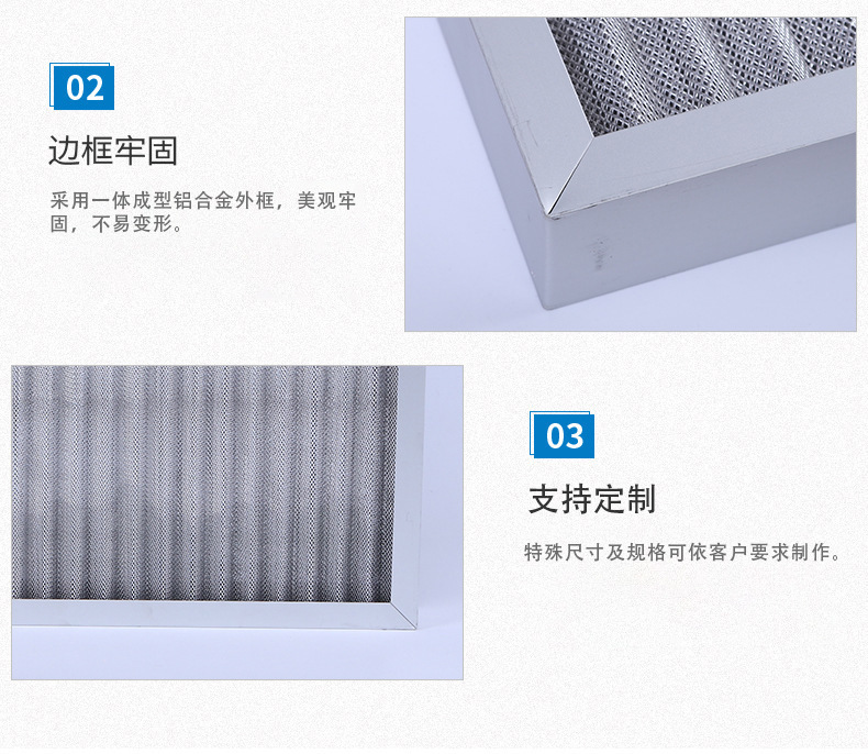 鋁波紋網(wǎng)過(guò)濾器采用多層鋁網(wǎng)經(jīng)輾壓成波浪形,以正確的角度彼此交叉疊合排列而成,多層金屬鋁波紋網(wǎng)是以不同的密度,孔徑由粗到細(xì)的排列,使空氣通過(guò)濾網(wǎng)時(shí)多次改變流動(dòng)方向,增大其集塵能力及效率。