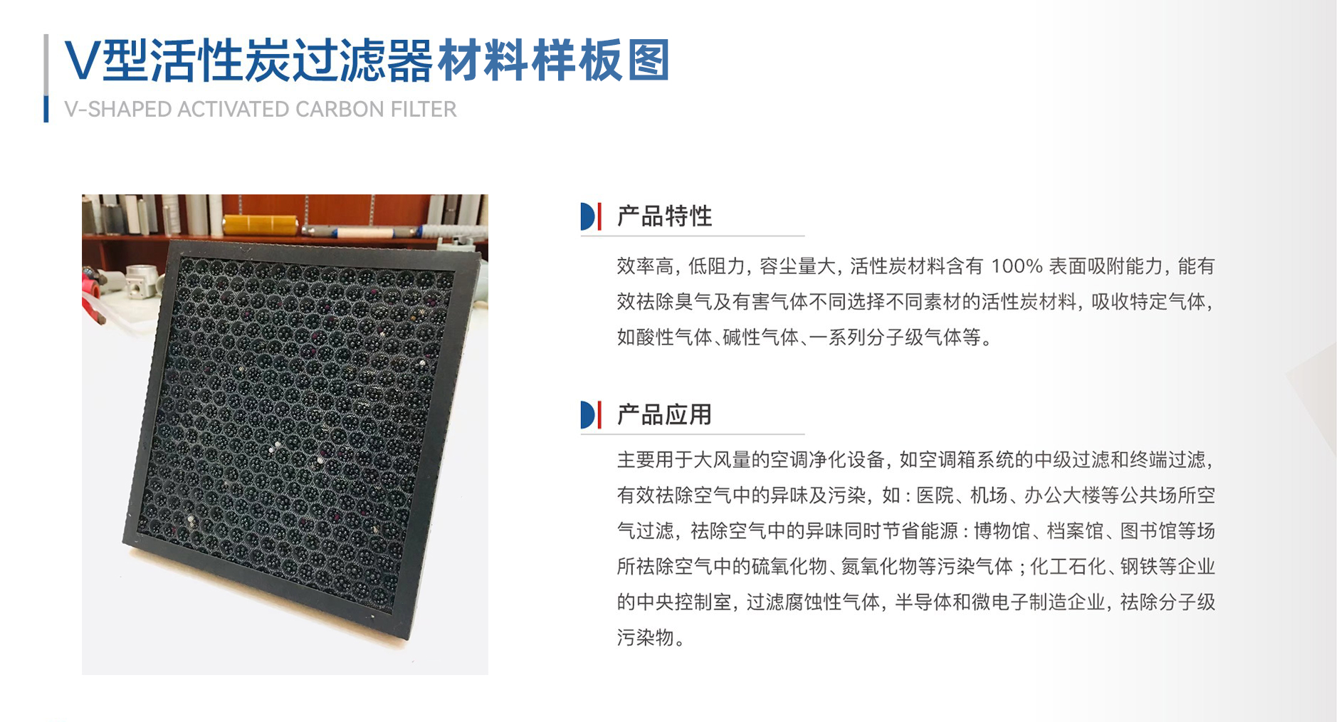效率高,低阻力,容塵量大,活性炭材料含有 表面吸附能力,能祛除臭氣及有害氣體不同選擇不同素材的活性炭材料,吸收特定氣體,如酸性氣體、堿性氣體、一系列分子級(jí)氣體等。