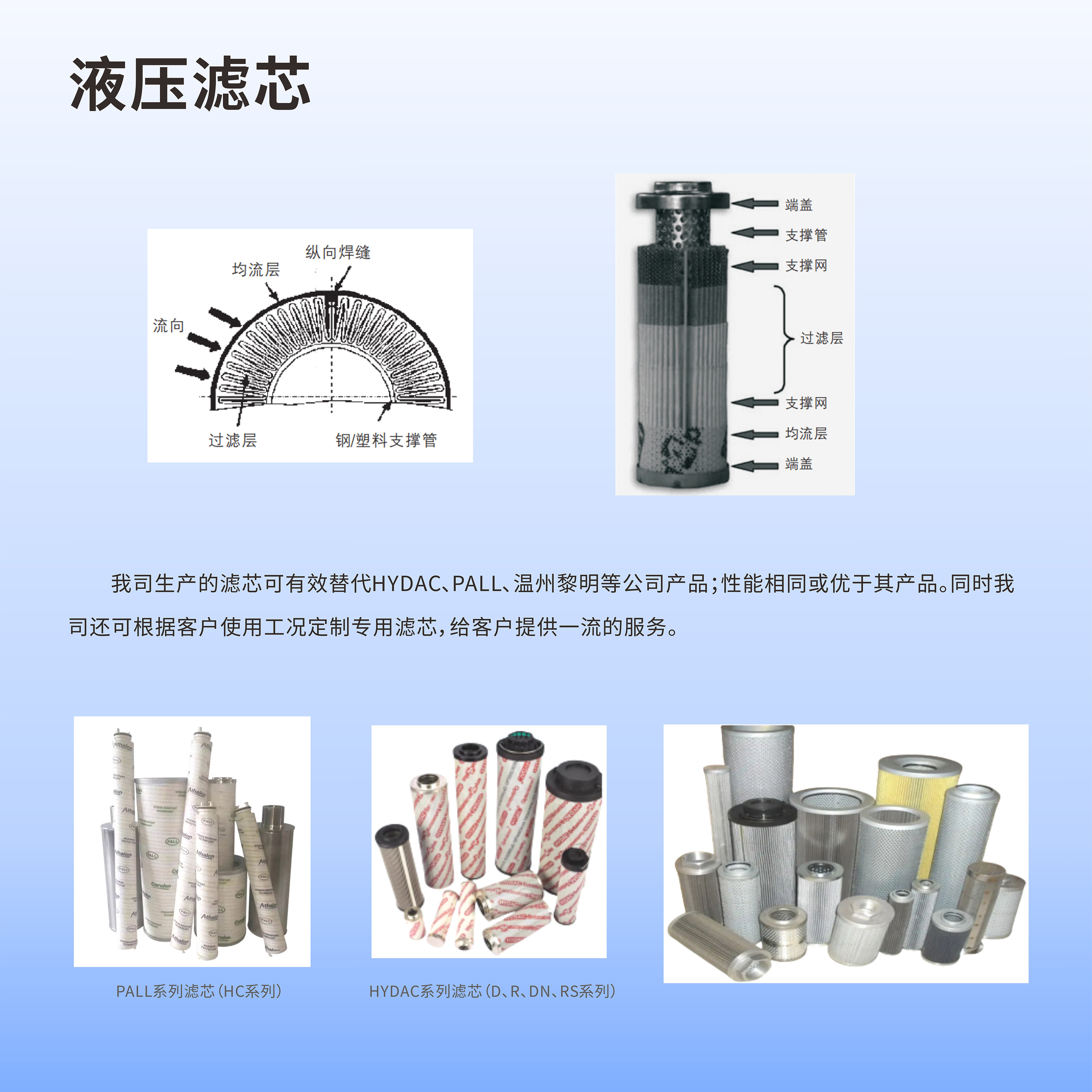 液壓濾芯由上、下端蓋,濾層(由過濾層、支撐層、均流層)以及骨架組成,濾層以圓柱體的形狀以圓柱體的形狀固定在內(nèi)、外骨架之間,并在上、下端蓋處密封,應用時根據(jù)實際情況確定液體的流動方向(從濾芯外流向濾芯內(nèi)部或從內(nèi)部流向外部)。